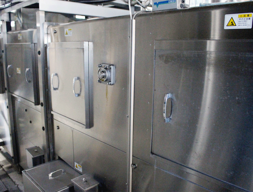 食材などの油汚れが付きやすい番重は、汚れの性質や付着箇所によって落ちにくいことも。そこで当社では、専任スタッフが一つひとつ丁寧に手作業で事前洗浄を行い、目立つ汚れをしっかり除去。その後、カゴと同様に高温・高圧の専用機械で殺菌洗浄を施すことで、見た目も衛生面も「新品同様」に仕上げます。
